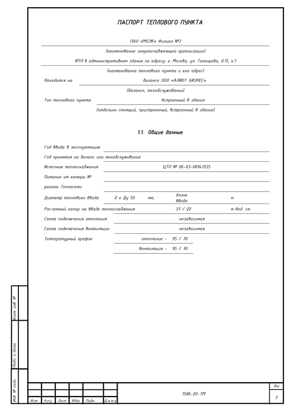 Рекомендуемая форма паспорта теплового пункта приведена в Приказе Министерства энергетики Российской Федерации от 24 марта 2003 г. № 115 «Об утверждении Правил технической эксплуатации тепловых энергоустановок»