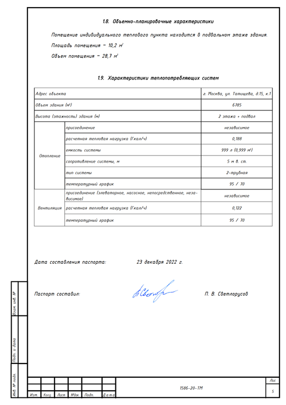 В соответствии с требованиями СП 510.1325800.2022 п.4.7 В состав проектной документацией теплового пункта следует включать технический паспорт, содержащий: